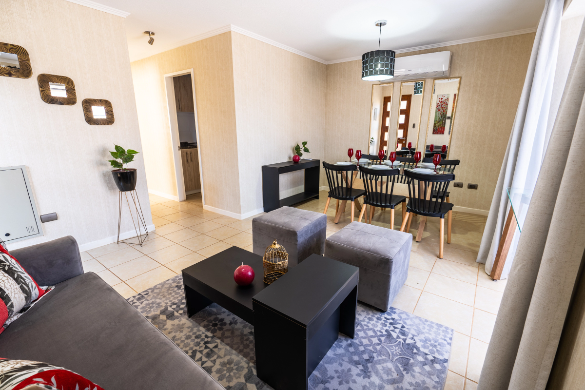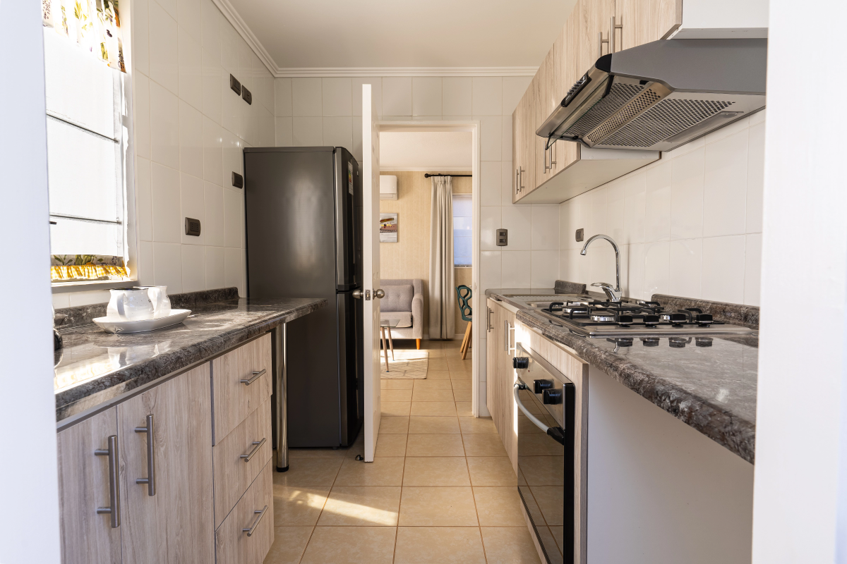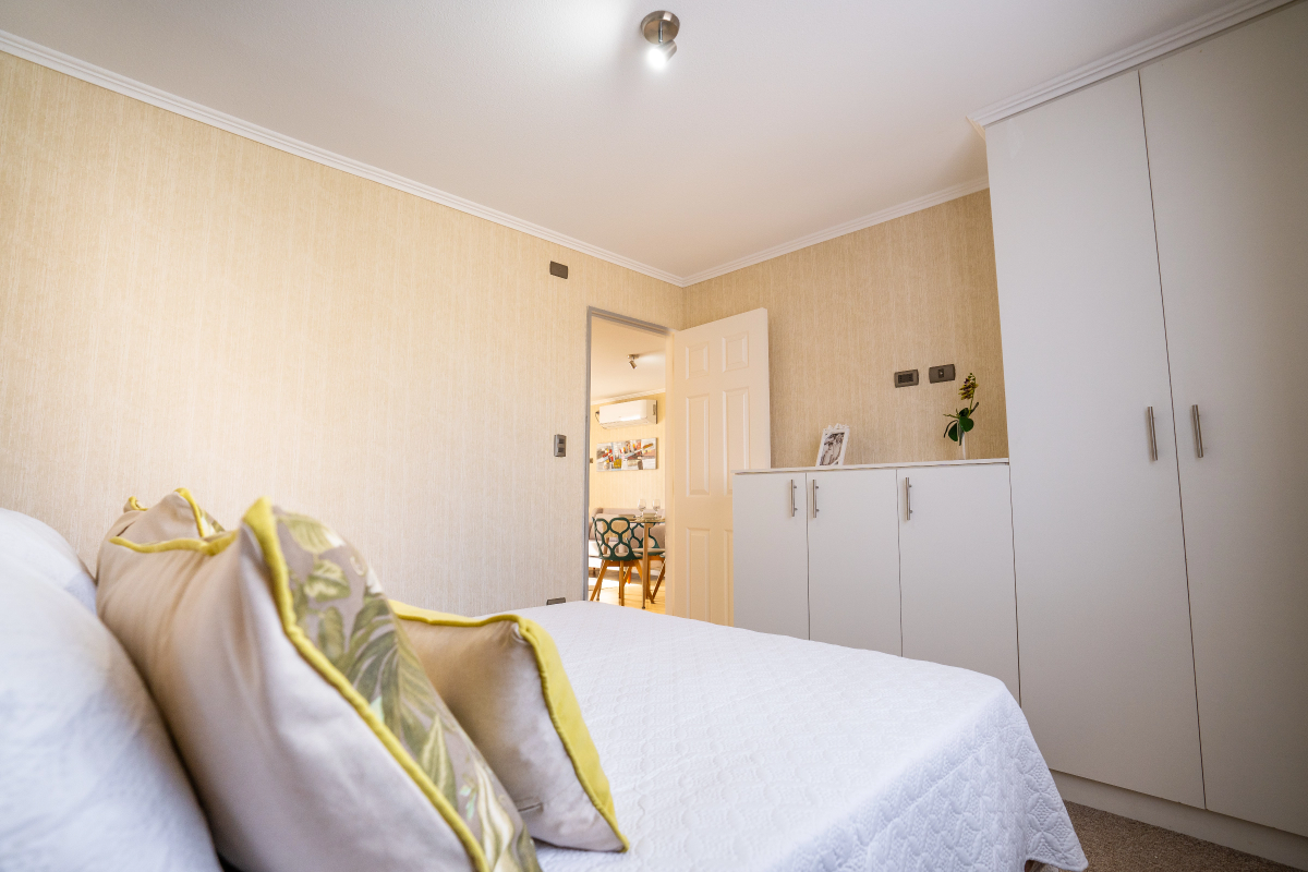 Cocina, living comedor, muros de albañería reforzada, alfombra tipo bouclé en dormitorios, citofonía.